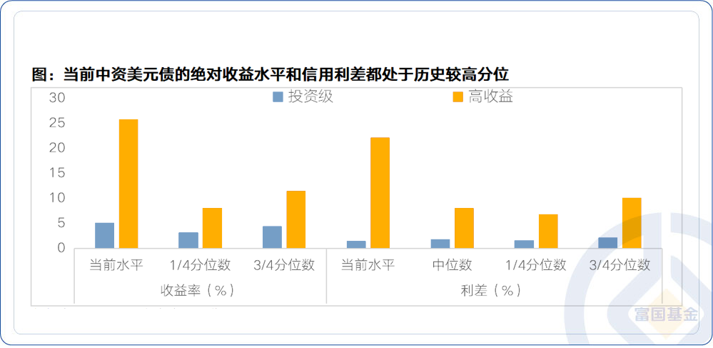 大类资产配置的指针转向了美债,但相较而言,中资美元债还多了一层信用修复的价值,当前中资美元债的绝对收益水平和信用利差都处于历史较高分位,未来的配置价值显现。