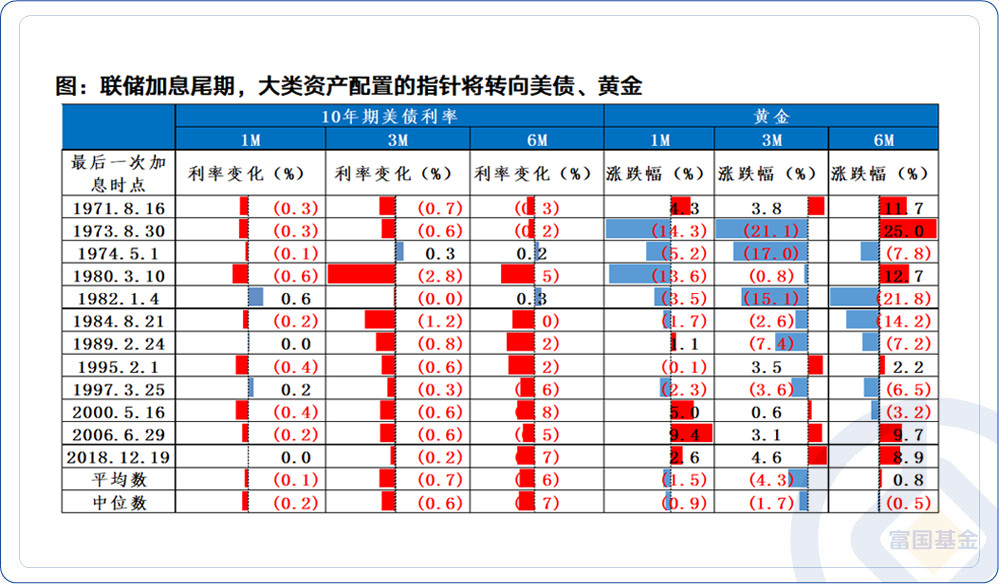 从历史经验来看,在过去12轮加息周期中,当进入到最后一次加息的时点时,向后推1个月、3个月、6个月,美债利率都迎来了较大幅度的下行,下行的概率也很高。3个时间段的下行幅度中位数分别为20bp、60bp、70bp,3个时间段的下行概率分别达到75%、92%、83%。相对而言,黄金的趋势没有美债那么明显,在6个月的维度下胜率相对高一些,与具体的时间区间相关性更高。