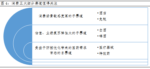 聚焦细分赛道,可以关注三个方向。一是消费场景敏感度高的子赛道,如酒店,在疫情期间供给侧去化,疫后复苏的弹性较大。二是估值、业绩复苏弹性大的子赛道,如白酒、啤酒,其中,白酒对大经济环境不敏感,估值也已回落到合理区间;而啤酒在高端化趋势下,未来成本下降有望进一步夯实业绩。三是政策愈发明确下景气改善的子赛道,如医疗器械、特效药,或将受益于防控优化带来的医药需求常态化。