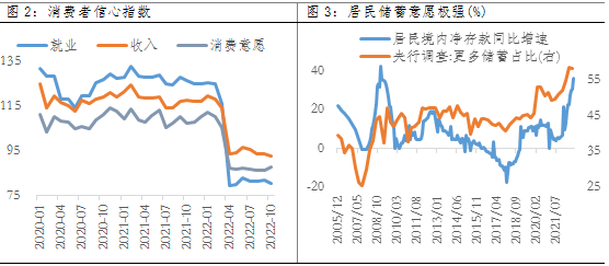 消费要好,得“有能力、有意愿、有场景”,且缺一不可。然而今年以来,疫情的反复导致消费者信心指数断崖式下滑,不仅就业、收入预期极差,消费意愿也极度低迷,叠加疫情防控也使得消费场景有所受限。此外,居民境内净存款同比增速从2021年底的6.74%飙升至2022年10月的36.18%,甚至接近2008年金融危机时42.52%的“尖峰时刻”;而且根据央行对城镇储户的问卷调查,“更多储蓄占比”也从2021年中的49%升至2022年底的62%,创下2005年以来的新高,储蓄倾向尤为强烈。