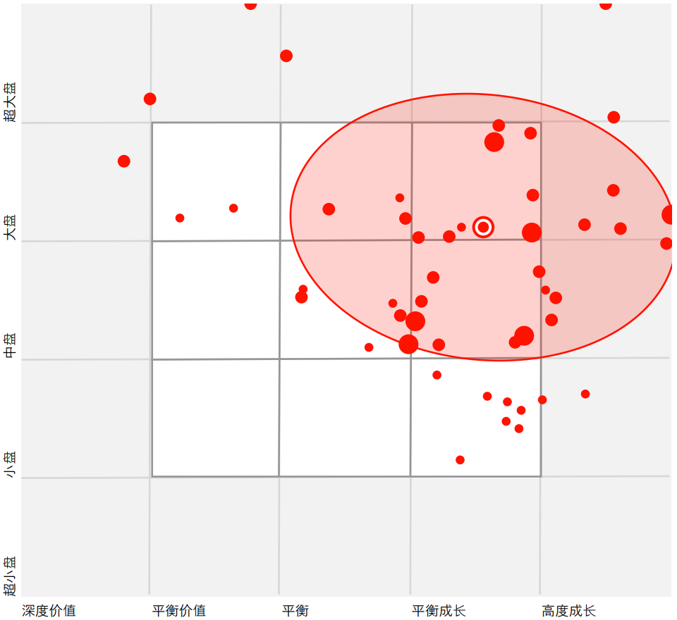 持仓风格图反映了最新一期基金持有的股票风格分布,越大的圆点代表了更高的持仓权重。阴影区域显示了75%的基金资产持仓分布,红色圆圈为“质心”,代表了基金持仓个股风格的加权平均值。根据中国公募基金半年报及年报的全持仓数据计算。