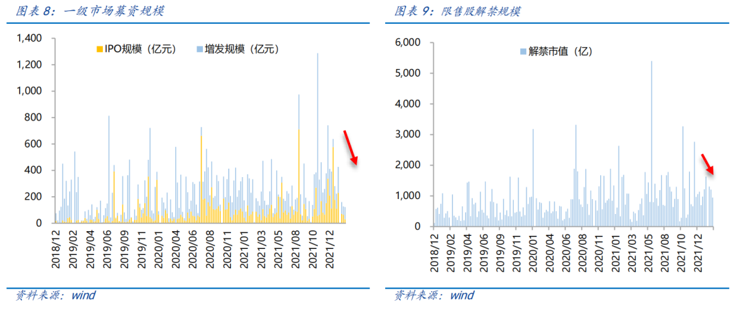 资金需求方面,本周一级市场规模继续回落,限售股解禁压力减小,重要股东减持规模减小。本周一级市场资金募集金额合计123.15亿元,较上周减少3.26%;结构上,IPO募集30.38亿元,周环比减少52.30%;增发募集92.77亿元,周环比增加45.85%。本周限售股解禁规模合计946.99亿元,周环比减少22.90%,根据目前披露的数据,预计下周解禁规模约417.46亿元,解禁压力将再下行。本周重要股东减持34.27亿元,上周减持76.34亿元,减持规模减小。