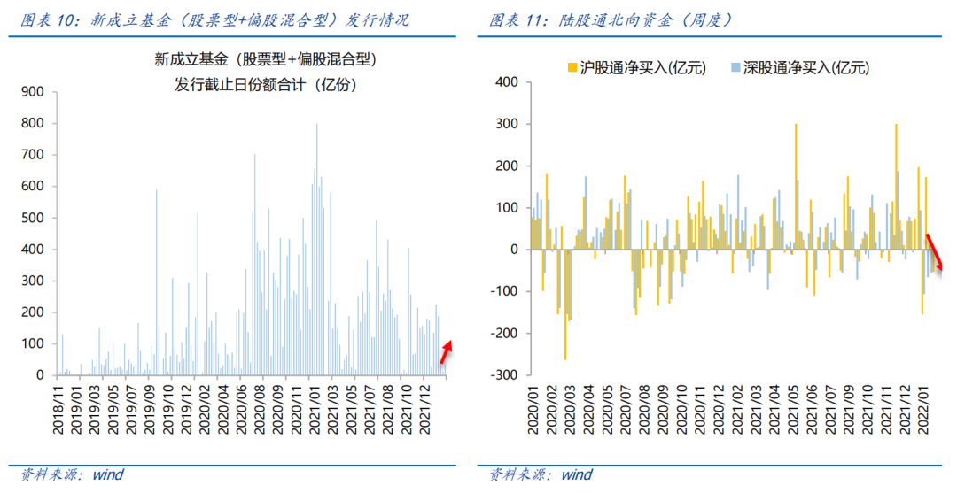 资金供给方面,本周基金发行回暖,北向资金持续净流出。本周北向资金净流出64.13亿,较上周减少167.35%,其中沪股通净卖出52.69亿元,深股通净卖出11.44亿元。本周新成立股票型及偏股混合型基金份额合计34.32亿份,环比增加164.32%,显示基金发行回暖。本周开放式公募基金份额较稳定,其中股票型份额微增至16401.91亿份,混合型份额微增至41020.95亿份。