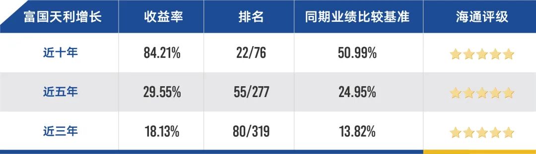 海通证券数据显示,截至2022年1月28日,富国天利近十年、近五年、近三年均获得海通五星评级,近五年排名更是位居前20%。