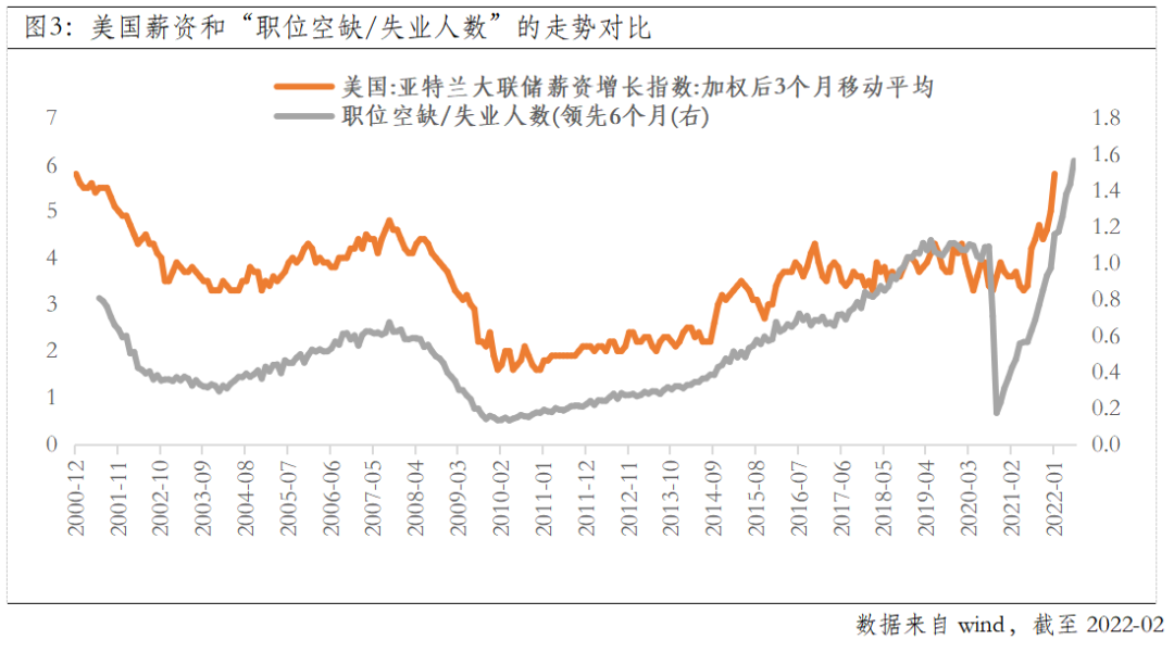 服务价格的上行压力主要来自劳动力成本,核心是源于劳动力市场的供给不足下,企业面临着招工难问题,只能不断提升薪资增速。虽然2月时薪环比增速仅0.0%,但两年平均增速仍高达5.2%。另外,从历史看,“职位空缺/失业人数”这一指标领先薪资增速大概6个月左右,若按此规律推演,“工资-通胀”螺旋转动还未到停止的拐点。