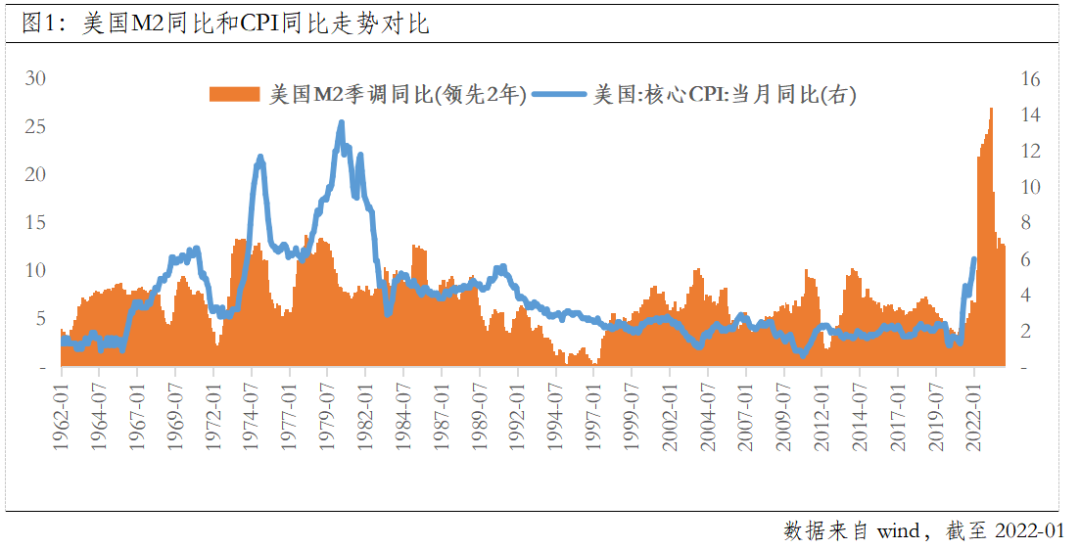 一个历史经验性的数据是,M2同比增速大约领先核心CPI同比2年左右,尤其是在货币超发时比较显著。从2020年以来M2的趋势看,2022年通胀依然有上行压力。