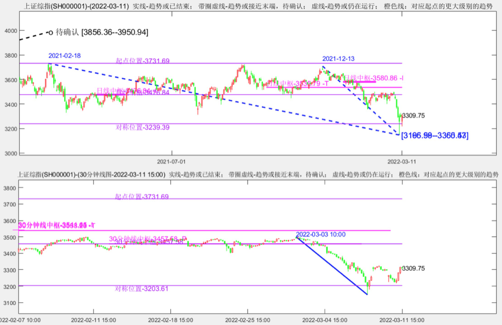 以上证指数为例,若以当下看到的位置最低的日线价值中枢或30分钟图上看到的位置最低的价值中枢为对称平台,那么上周的低点与2021年2月中旬高点恰好围绕该价值中枢对称,这意味着上周的低点已经是一个与2021年2月中旬高点情绪级别相当的极端位置了。
