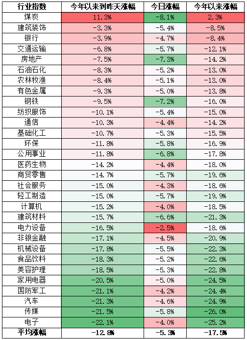 级掌柜鼓起勇气,回看今年以来各个行业的涨跌情况,发现仅剩煤炭幸存。