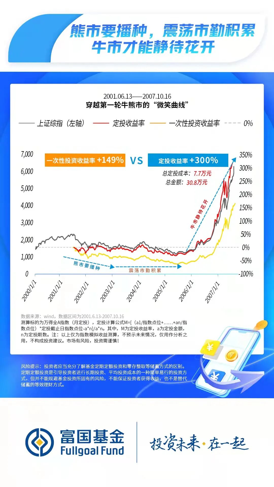 wind数据显示,穿越第一轮牛熊市“微笑曲线”,自2001年6月13日至2007年10月16日,一次性投资收益率上涨149%,定投收益则高达300%;