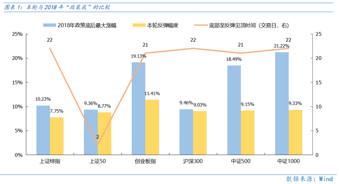 参考2018年10月19日金稳委会议后的“政策底”,各指数的反弹力度与本轮比较,当前市场触及“政策底”后的快速反弹幅度或过半,但时间窗口期仍在。2018年“政策底”后,上证综指、上证50、创业板指、沪深300、中证500和中证1000较低点的最大涨幅分别为10.23%、9.36%、19.13%、9.46%、18.49%和21.22%,底部反弹至顶部时长中位数为21个交易日。故本轮反弹的幅度或已过半,但反弹延续的时间仍短,下周或仍是市场反弹的窗口期。