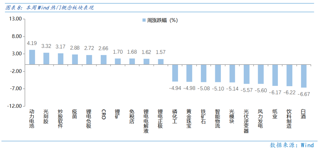 本周动力电池细分板块走强,逆变器细分板块走低,主要原因是前期市场调整中,新能源车及动力电池板块回调力度较大,而光伏及逆变器板块表现较为强势,在“金稳委”喊话后,资金优先布局跌幅较大的动力电池板块,而前期逆市上扬的逆变器板块则有一定资金的盈利兑现。从Wind热门概念板块来看,表现相对靠前的是动力电池(4.19%)、光刻胶(3.32%)、炒股软件(3.17%)、疫苗(2.88%)、锂电负极(2.72%);表现相对靠后的是白酒(-6.67%)、饮料制造(-6.22%)、纸业(-6.17%)、风力发电(-5.6%)、光伏逆变器(-5.57%)。虽然逆变器板块回调力度较大,但出口数据显示行业依旧增长稳健。1-2月逆变器出口分别为4.95、3.49亿美元,同比增长39.42%、3.75%,累计出口8.44亿美元,同比增