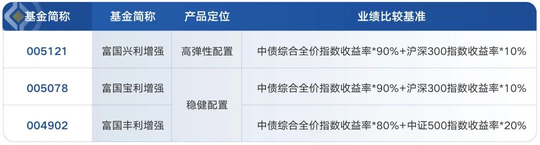 皆为量化方法管理的二级债基,富国兴利增强、富国宝利增强、富国丰利增强可以根据其产品定位及业绩比较基准简单划分如下👇