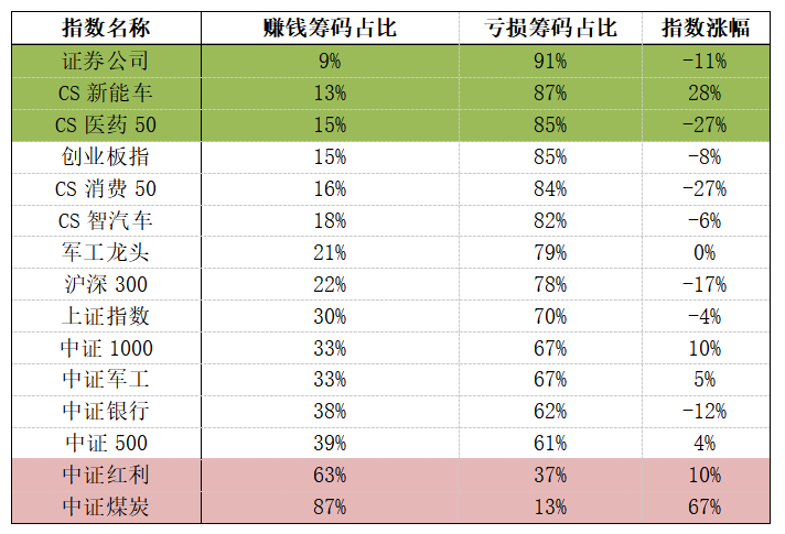 在这两个指数中,大多数筹码还在赚钱,尤其是煤炭,赚钱筹码占比达到87%,最近一年简直买到约等于赚到。