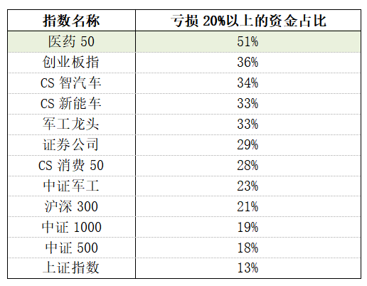 表:各指数亏损20%以上的资金占比