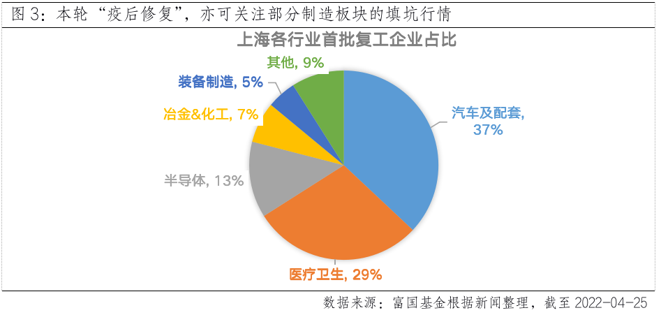 相较而言,尽管年初以来赛道股的性价比已有一定改善,但在市场磨底阶段、美债收益率上行,以及上游成本走高背景下,成长行情仍面临较大约束。预计短期全市场的交易重心或仍在低风险板块,如政策导向的稳增长和“疫后修复”板块。尤其参考2020年新冠疫情以来,每一轮国内疫情扩散至有效控制之后,“疫情受损链”均存在阶段性上涨及超额收益,叠加本轮疫情新还造成供应链停摆,因此“疫后修复”演绎中,消费板块修复行情预计不会缺席外,部分制造板块亦有填坑行情。
