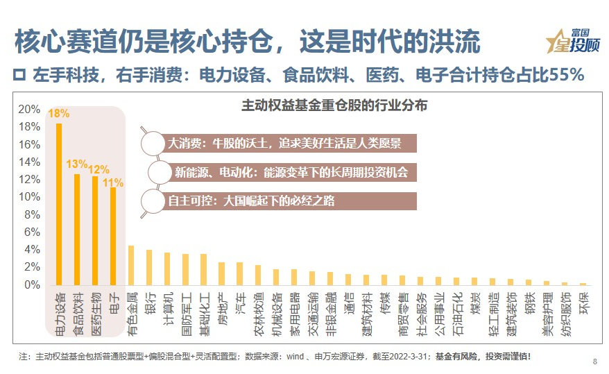 8、核心赛道仍是核心持仓,这是时代的洪流。大消费是牛股的沃土,因为追求美好生活是每个人的愿景;新能源、电动化是能源变革下的长周期投资机会;而自主可控是大国崛起下的必经之路。