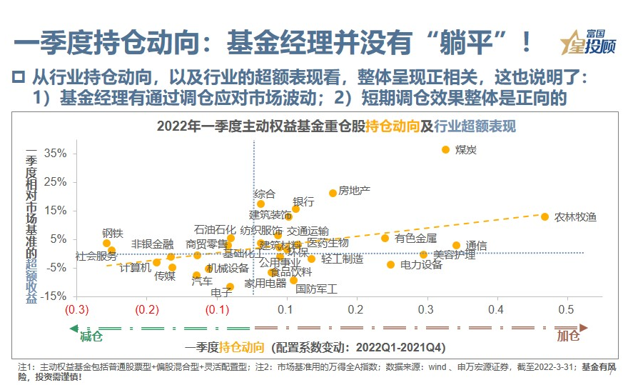 7、从一季度持仓动向看,基金经理并没有“躺平”!证据三:主动权益基金重仓股中,行业的加减仓情况,以及行业的超额表现,呈现明显的正相关。这也说明了,基金经理有通过“行业调仓”来应对市场波动,而且短期效果整体正向。