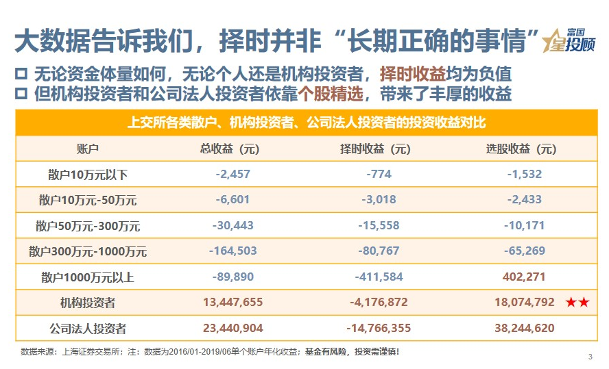3、择时并非“长期正确的事情”。根据上交所的研究,无论你是何身份,无论你钱多钱少,择时的收益都为负,这也就是说,择时并非明智之举。相反,我们可以看到的是,机构投资者凭借自身强大的“研究基因”,能够通过选股来贡献更多的正收益。