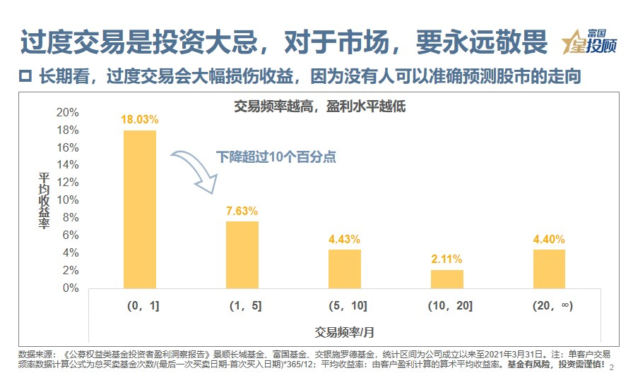 2、过度交易是投资大忌,对于市场,要永远敬畏。市场先生是一个阴晴不定、难以琢磨的“疯子”,不要总想着战胜它,而应该保持谦逊、懂得敬畏。数据为证,拉长时间看,过度交易会大幅损伤收益水平,因为没有人可以准确预测股市的走向。
