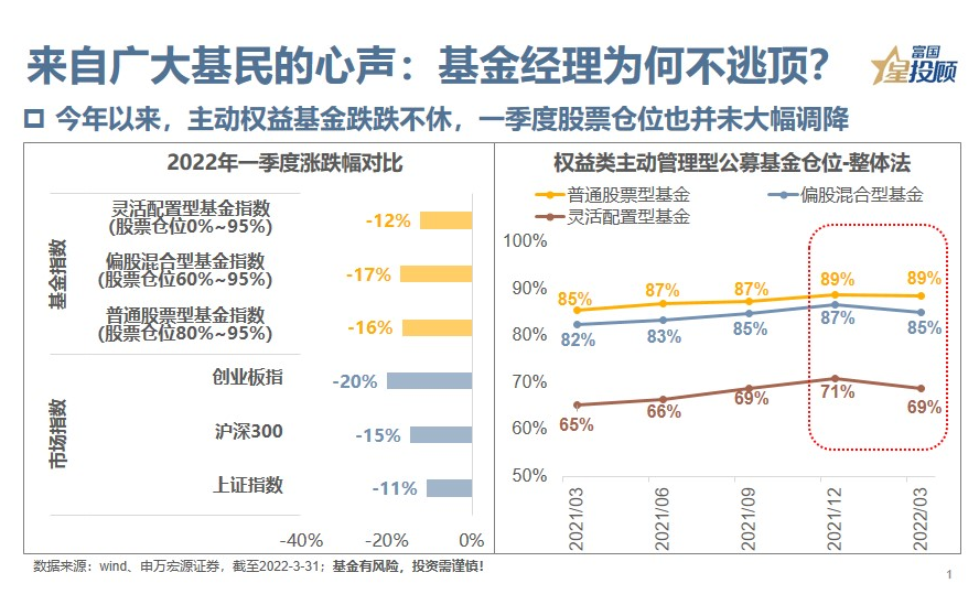 1、来自广大基民的心声:基金经理为何不“逃顶”?今年以来,A股市场一步步跌破大家的心理防线,权益类基金也是跌跌不休。从一季报数据看,主动权益基金的确并没有大幅降仓,但这真的不是基金经理们的“锅”。