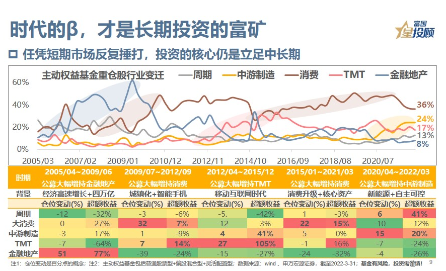 9、时代的β,才是长期投资的富矿,任凭短期市场反复捶打,仍在坚守立足长期的初心。从主动权益基金持仓的行业变迁看,更多是对时代的理解和追寻,毕竟在时代面前,我们也不过是一粒尘埃。