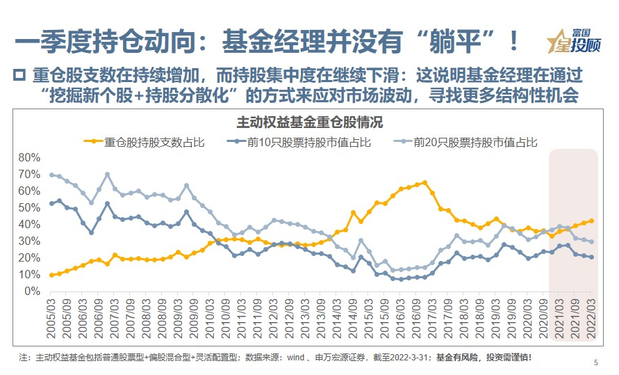 5、从一季度持仓动向看,基金经理并没有“躺平”!证据一:主动权益基金的重仓股支数在持续增加,而持股集中度在继续下滑。这说明基金经理有通过“挖掘新个股+持股分散化”的方式来应对市场波动,寻找更多结构性机会。
