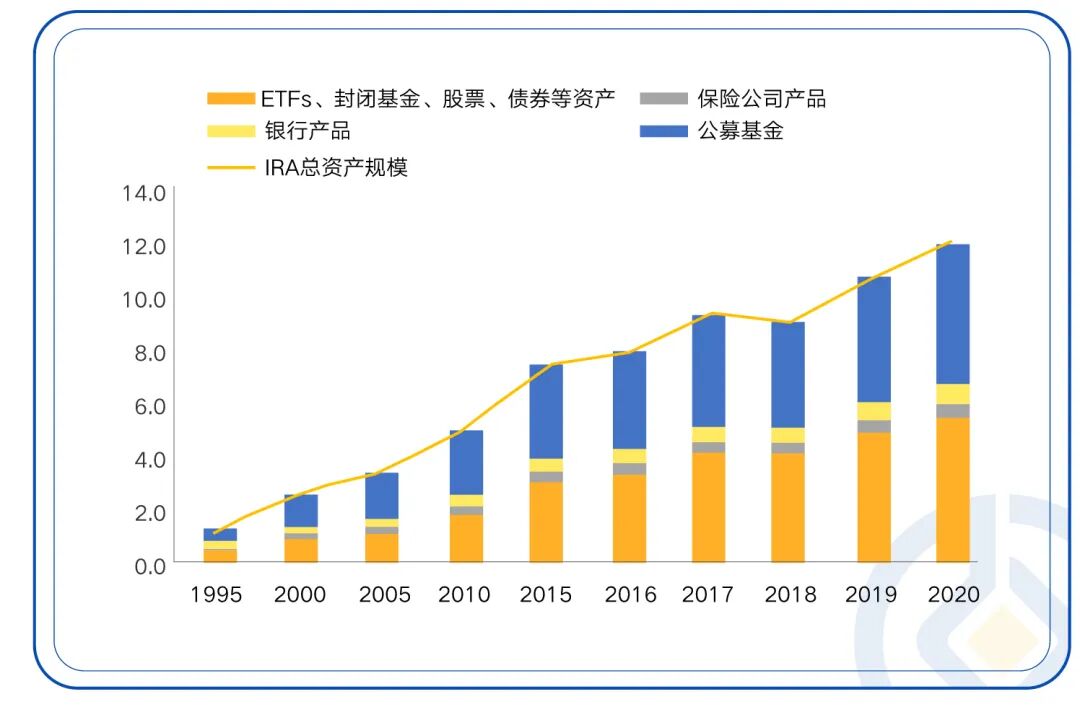 以美国个人养老账户IRA为例,2020年存量规模达12.2万亿,约占美国养老金总资产的35%左右。其中,约45%的资金投向公募基金,另有46%的资金投向ETFs、封闭基金、股票、债券等资产,只有不到10%的资金投向银行和保险提供的产品。