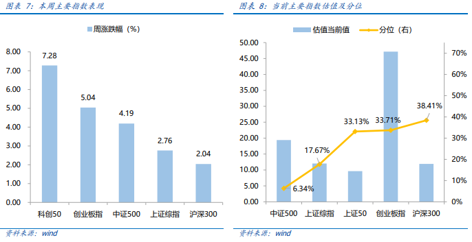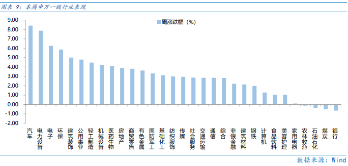 近一周,成长风格占优。近一周,上证指数上涨2.76%,创业板指上涨5.04%,沪深300上涨2.04%,中证500上涨4.19%,科创50上涨7.28%。风格上,成长、周期表现相对较好,金融、消费表现较差。从申万一级行业看,表现相对靠前的是汽车(8.41%)、电力设备(7.87%)、电子(6.26%)、环保(5.86%)、建筑装饰(5%);表现相对靠后的是银行(-0.65%)、煤炭(-0.51%)、石油石化(-0.35%)、农林牧渔(-0.12%)、家用电器(0.11%)。