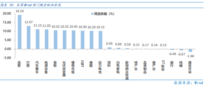 本周疫情形势有所好转,受汽车下乡等政策利好推动,汽车产业链复苏预期增强。从Wind热门概念板块来看,表现相对靠前的是连板(19.19%)、打板(12.97%)、汽车整车(11.13%)、电源设备(11.03%)、首板(10.55%);表现相对靠后的是煤炭开采(-1.6%)、纯碱(-0.67%)、银行(-0.49%)、ST板块(0.12%)、猪产业(0.14%)。