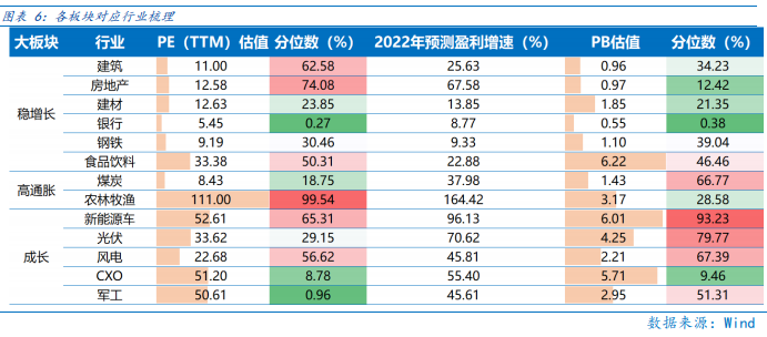 成长板块:着眼长期布局,当前成长板块的新能源车、光伏、军工、半导体等行业已经具有估值性价比,但受海外流动性收紧压制短期表现承压,可关注海外流动性紧缩预期放缓的反弹机遇。