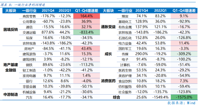 高通胀板块则是在通胀的“外困”暂时未缓解的背景下,寻找能源通胀受益的煤炭、石油石化行业,俄乌冲击扰动供给引发的食品通胀受益的农林牧渔行业和钾肥涨价受益的化肥行业。