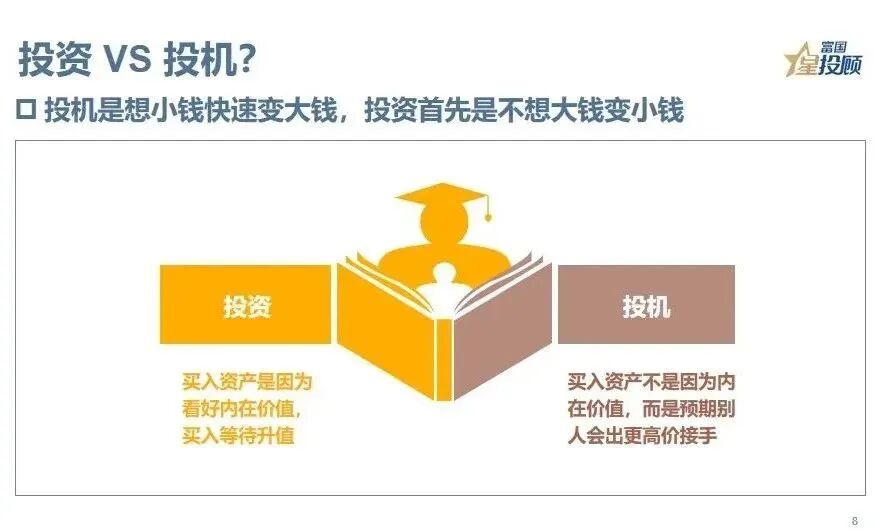 投资还是投机?要正确看待。对于投资,买入资产是因为看好内在价值,所以长期持有,等待价值实现。对于投机,买入资产并不是因为内在价值,而是预期别人会更高价接手,快速小钱变大钱。
