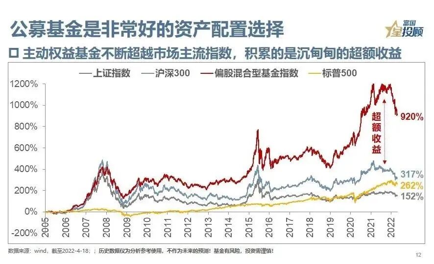 A股市场对投资者不一定友好,但国内基金市场一定要被温柔以待,因为公募基金是非常好的资产配置选项。自2005年以来,主动权益基金不断超越市场主流指数,甚至是“股神巴菲特”推荐的标普500,其积累的超额收益就是“创造价值”的最好证明。