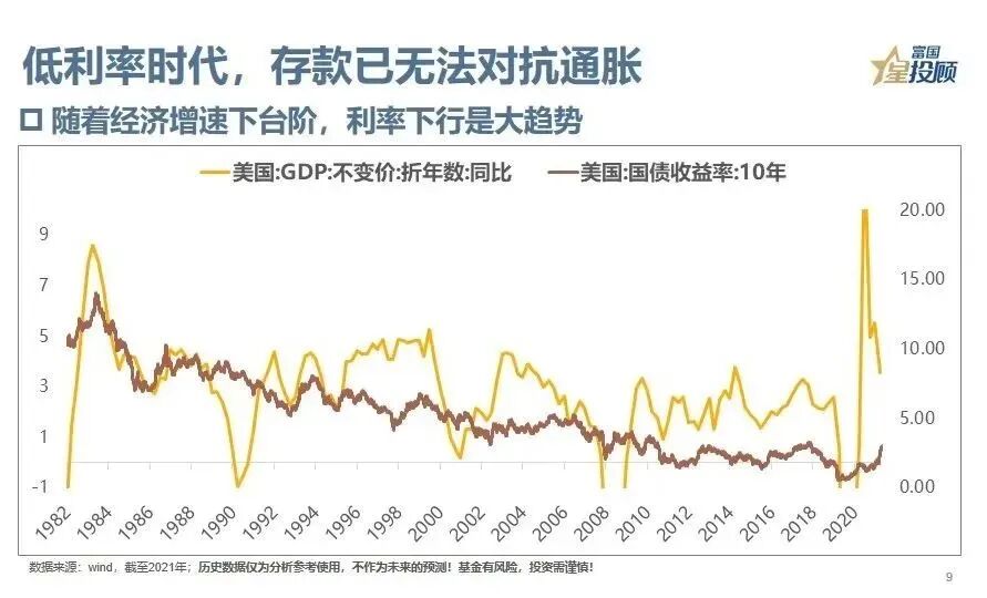 低利率时代,存款已无法对抗通胀。从海外经验看,利率水平和经济增速是相伴相生的,随着经济增速的下台阶,利率也会跟随下台阶。然而,极低的利率水平,已经无法让大家通过储蓄,来实现财富不缩水。