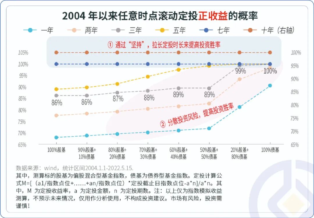 统计2004年以来任意时点滚动定投的正收益的概率数据可以发现: