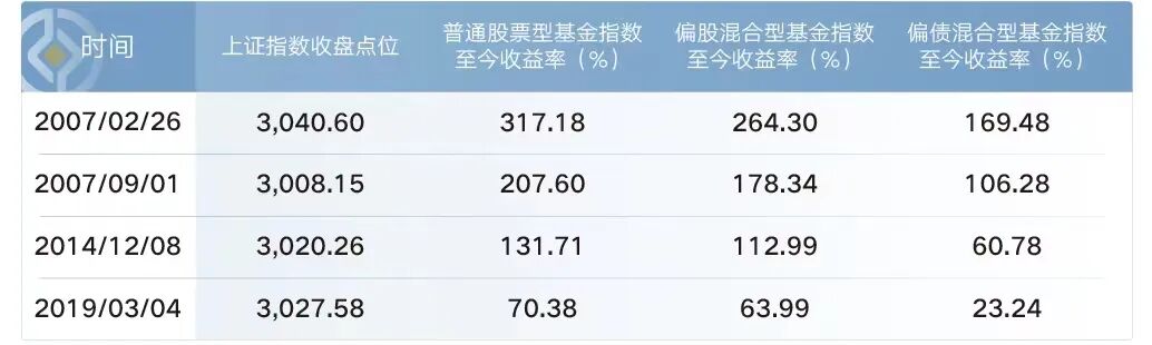 我们选取了历史上较有代表性的上证指数收复3000点的时间节点,截取了三种基金指数从大盘收复3000至今的收益率。