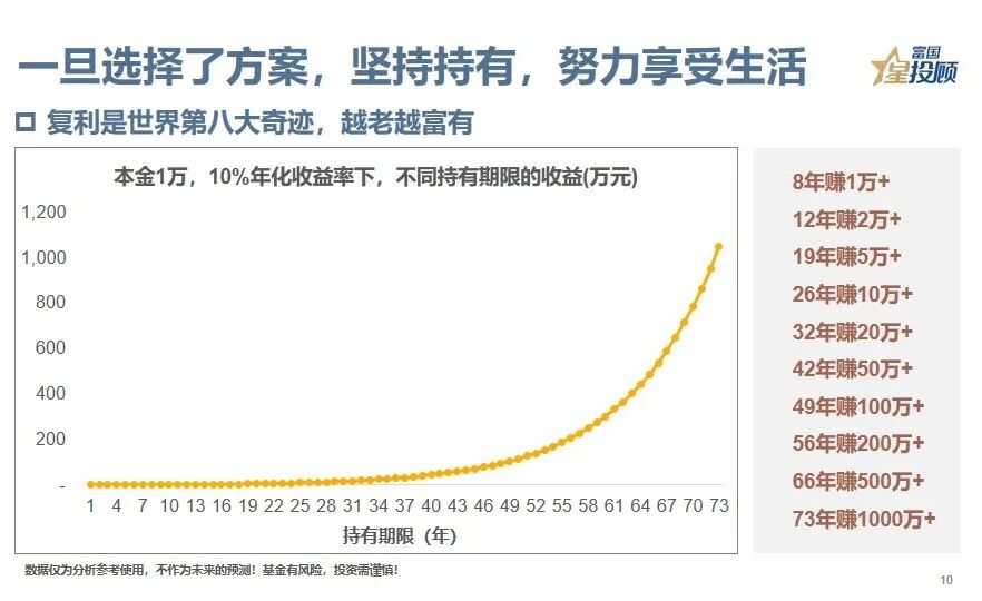 10、把资金交给对的人,把时间留给爱的人。一旦选定了方案,就坚持持有,努力享受生活吧,剩下的就交给时间,享受复利的力量。