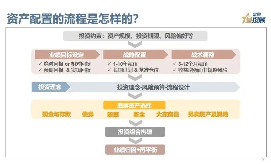 9、资产配置的流程是如何的?资产配置是个一系列流程,需要客观认识自我、确定目标,设定长期战略配置、中短期战术调整,做好底层资产选择、投资组合构建,以及再平衡与业绩归因等。