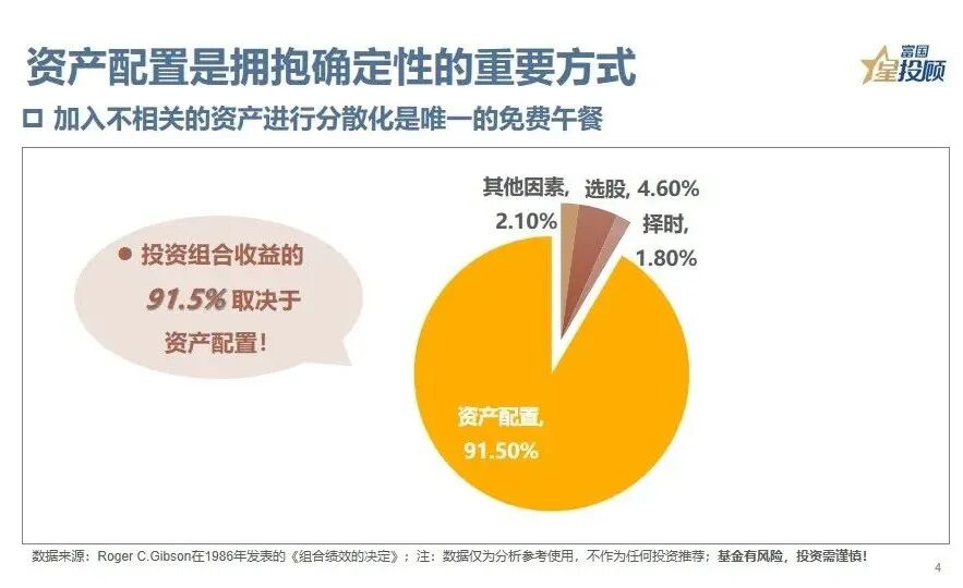 4、该如何提高组合的反脆弱性?资产配置关键。研究显示,投资组合收益的91.5%取决于资产配置,而且分散投资是世界上唯一免费的午餐,能够让组合的收益和安全性,既得熊掌又取鱼。