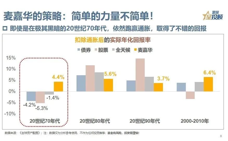 8、麦嘉华的策略:简单的力量不简单!最让人不可思议的是,他的策略虽然简单粗暴,但稳定性极高。即使是在极其黑暗的20世纪70年代,依然跑赢通胀,取得了不错的回报。