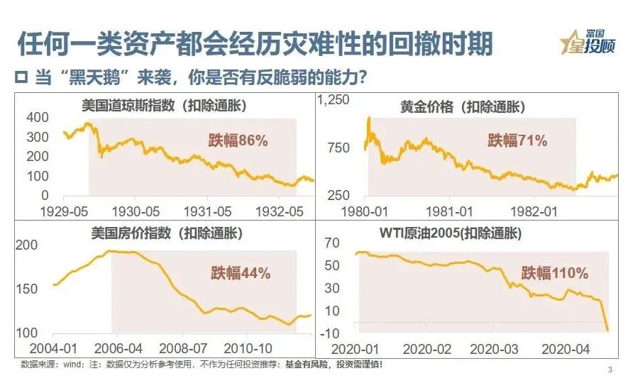 3、第二要了解的是,任何一类资产都会经历灾难性的回撤时期,关键是当“黑天鹅”来袭时,你是否有反脆弱的能力。历史上看,无论是股票、债券、黄金、房子、原油,都会经历至暗时刻,若只押注某一品种,无异于刀口舔血,因为80%的跌幅需要400%的涨幅才能回本。