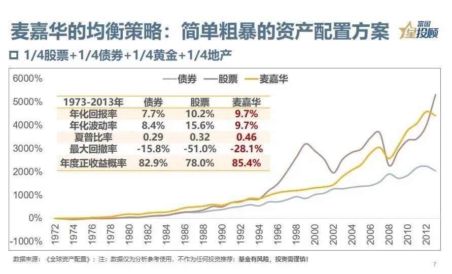 7、经典策略二:麦嘉华的均衡策略。麦嘉华是一位久居亚洲的瑞士经济学家,也被称为“末日博士”,以与市场唱反调而著称。他的资产配置方案尤为简单粗暴,即在股票、债券、黄金和房地产四个领域均衡配置。从40年周期看,也取得了不错的效果,年化回报接近股票,年度正回报概率超过了债券。