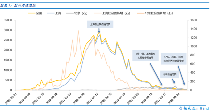 全国疫情显著趋缓,北上疫情均得到有效控制,经济复苏兑现的强度或不弱,对应A股机遇可寻。本周全国日均新增病例已降至200例的低位平台,是4月中旬以来新低,且上海市首次社会面清零已经超一周,北京市5月27日起连续2日无社会面新增。具有指标意义的北上疫情均得到有效控制,对提振市场信心作用明显,且改善弹性大的疫后复苏板块是主要的机遇点。
