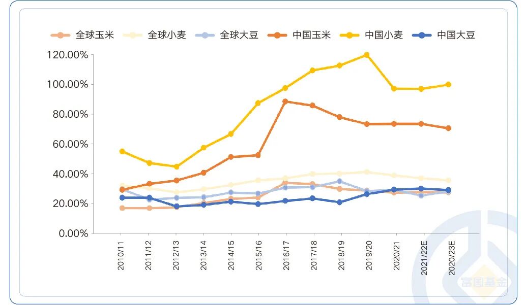 全球和中国玉米、小麦、大豆供需平衡表(库存消费比%):