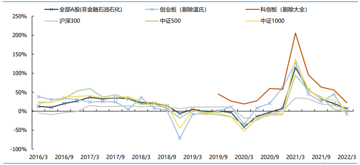 一季度A股盈利增速回落,受疫情扰动,盈利底或在二季度末到来。 一季度全A和全A(非金融非石油石化非四大航)净利润增速分别为3.9%和7.8%,延续回落的趋势,但考虑4月的疫情影响,盈利增速触底或于二季度到来。 盈利回落力度而言,中证500和中证1000一季度盈利增速回落较大,分别放缓13.6%和 12.4%,对应的其今年以来表现分别跌24.4%和28%,跌幅靠前。在盈利探底期,以 500和1000为代表的中小盘或继续表现承压,但市场二季度盈利见底后,可关注中小盘盈利回升和市场预期好转带动估值回升的“戴维斯双击”的机会。
