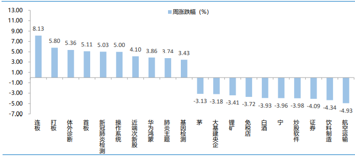 本周美联储加息落地,紧缩预期下10年期美债收益率突破3%,离岸人民币跌破6.7,利空冲击下市场整体下跌。从Wind热门概念板块来看,表现相对靠前的是连板(8.13%)、打板(5.8%)、体外诊断(5.36%)、首板(5.11%)、新冠肺炎检测(5.03%);表现相对靠后的是航空运输(-4.93%)、饮料制造(-4.34%)、证券(-4.09%)、炒股软件(-3.98%)、宁指数(-3.96%)。