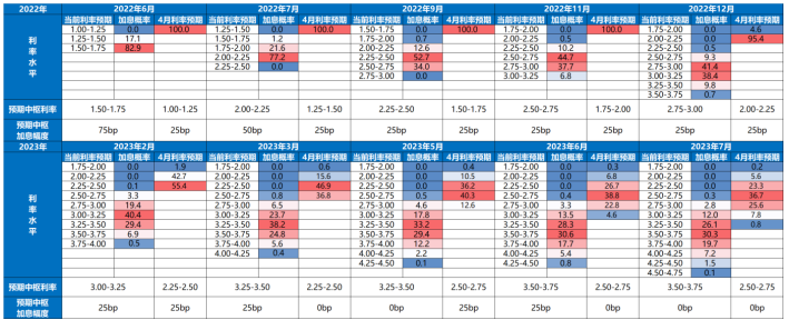 海外而言,联储50bp加息落地,缩表在即,短期来看,美股高波动期尚未结束,会对 A股形成扰动。 5月5日,标普500指数下跌3.56%,此前一天,美联储发布最新的升息声明后,该指数上涨3.0%。在本周,标普500指数出现了自两年前疫情爆发扰乱市场以来的两次最大单日跌幅。 美股波动的影响因素主要是紧缩预期再次抬升,受经济数据的影响较小。 虽然5月 FOMC会议上鲍威尔表示加息75BP并非积极考虑的选项,但市场的紧缩预期仍有抬升。截至今日,市场预期6月美联储加息75BP的概率达到82.9%,而4月这一概率为0。加息之外,6月即将开启缩表,本轮联储或缩表2万亿,以单月950亿的速度测算要持续近2 年的时间。历史经验而言,缩表启动前后的美股短期是承压的,因此美股高波动期或会延续。 图表5:利率期货显示的联储加息节奏