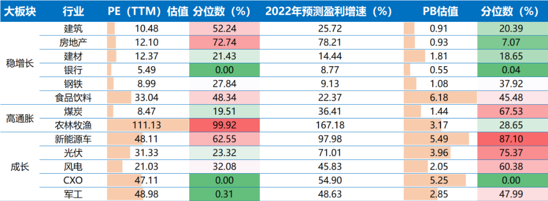 行业配置上,依旧聚焦稳增长和高通胀板块,长期配置角度布局成长板块。 稳增长板块主要聚焦底线思维,疫情使得GDP增速5.5%的缺口扩大,要更大力度的“稳增长”来填补,而最直接的稳增长即地产和基建投资,因此相关建筑、房地产、建材、银行等行业显著受益。长期而言“稳增长”最终要“稳消费”,因此逢低可配置食品饮料等消费行业。 高通胀板块则是在通胀的“外困”暂时未缓解的背景下,寻找能源通胀受益的煤炭、石油石化行业,俄乌冲击扰动供给引发的食品通胀受益的农林牧渔行业和钾肥涨价受益的化肥行业。 成长板块要着眼长期布局,当前成长板块的新能源车、光伏、军工、半导体等行业已经具有估值性价比,但受海外流动性收紧压制短期表现承压,可关注海外流动性紧缩预期放缓的反弹机遇。 表7:对应行业梳理