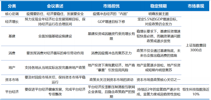 市场的压制依旧是两重“外困”(海外流动性收紧压制和高通胀)和两重“内困”(疫情蔓延冲击经济和市场增量资金不足),而市场的支撑是态度更为积极的政策。 4月政治局会议进一步夯实“政策底”,“盈利底”和“市场底”会逐步到来。考虑疫情冲击,A股“盈利底”或在二季度末,而“市场底”通常领先于“盈利底”,因此当前仍处于“政策底”到“市场底”之间的磨底阶段。此阶段A股或仍有短期探底的可能性,但由于“政策底”夯实,市场已是底部区域。受海外流动性和国内疫情潜在扩大的扰动,市场或会有短暂的“V”型探底回升,因此市场大幅波动时,逆势布局是应有之义。 4月政治局会议集中破除担忧,稳定预期。 政治局会议集中回应了市场对宏观经济、资本市场和平台经济的担忧,不仅重申经济增长目标,而且阐明通过稳基建、消费、地产的方法稳经济,从根本上提振了信心,稳定了预期。 政治局会议表态积极进一步夯实了“政策底”,未来随着会议精神逐步落实,具体政策会在A股探寻“市场底”时逐步发力。 图表1:429政治局会议内容梳理