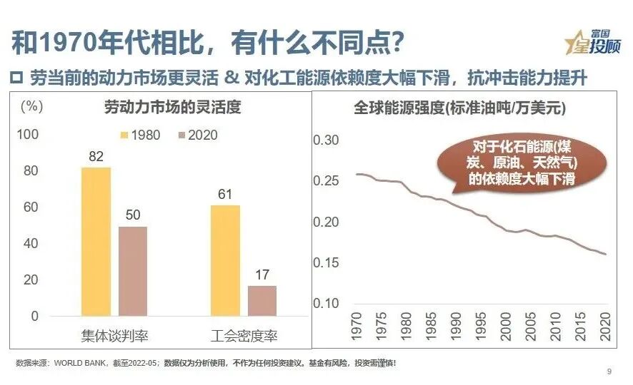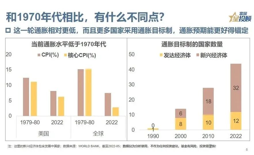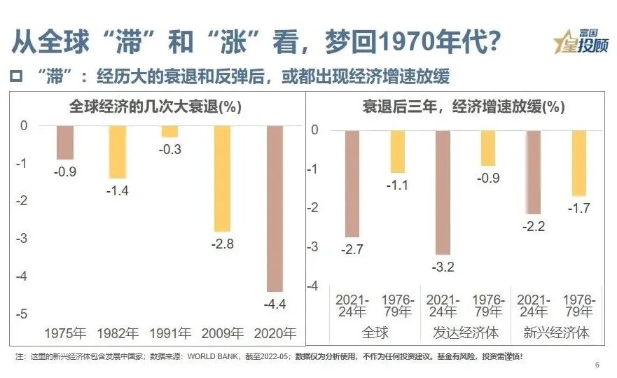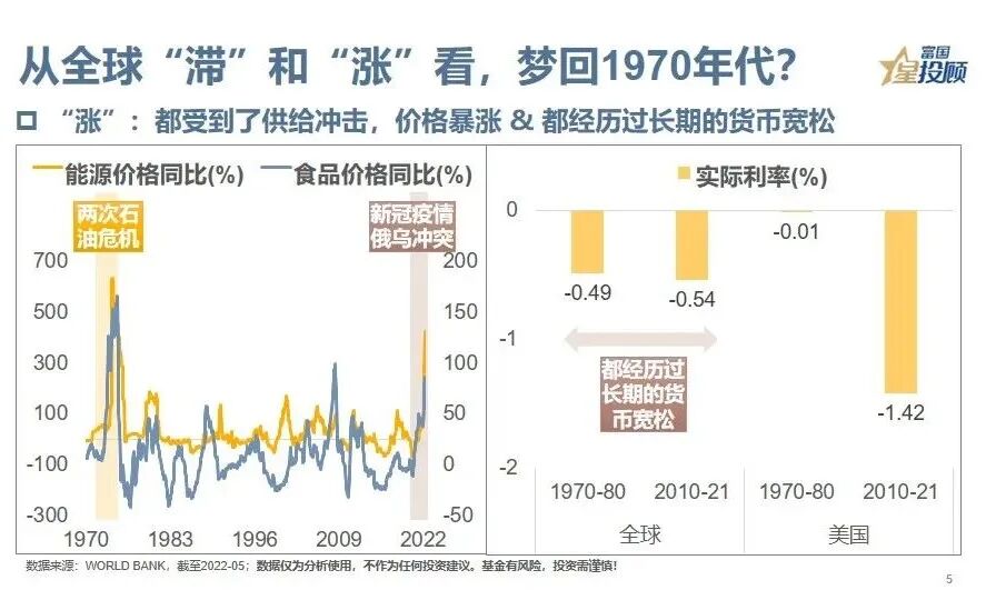 从全球“涨”的角度看,梦回1970年代?1970年代经历的两次石油危机,2020年以来的新冠疫情叠加俄乌冲突,都对供给端形成了巨大的冲击,造成了能源和食品价格的暴涨。此外相似的是,在此之前,都有经历长期的货币宽松,以及负利率时代。